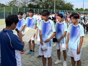 また、団体戦の開会式において大崎支部ソフトテニス専門部表彰が行われ、3年間の成績や真摯に取り組んだ功績が認められた4名が表彰されました。お疲れ様でした。