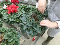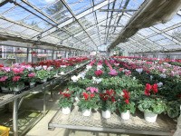 こちらのハウスでは,2年生が葉組の作業実習を行っています。ハウスの中は,色とりどりのシクラメンでいっぱいです。今年は花が大きいようです。