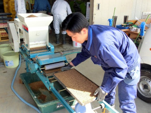 農業技術科農業科学コース作物専攻班2・3年生でササニシキやひとめぼれなど6品種を機械で播種しました。事前に土を入れていた育苗箱を播種機に並べ、みんなで協力して行いました。播種した育苗箱はその日にハウスに延べ670枚きれいに並べました。元気に育ってくれるといいな。と思いながら作業をしました。