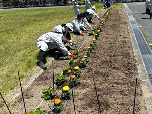 6月9日(木),総合実習の時間に草花専攻班2年生10名が,学校の駐車場脇の花壇にアフリカンマリーゴールドやペチュニアなど計7種類の花壇苗を植栽しました。