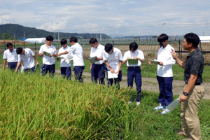 5月連休明けに田植えした、3年生担当の各圃場のイネは順調に生育し、7月下旬から8月上旬にかけて出穂を迎える前の管理作業である溝切りを行いました。