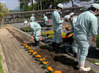 6月9日(木),総合実習の時間に草花専攻班2年生10名が,学校の駐車場脇の花壇にアフリカンマリーゴールドやペチュニアなど計7種類の花壇苗を植栽しました。