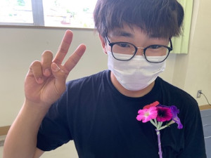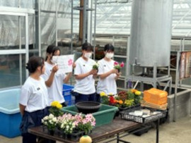 6月27日(月)に草花専攻班3年生9名が美里町にある花屋さんからコサージュ作りを学びました。材料に使用したのは,自分たちが種から栽培したマリーゴールドやペチュニアなどの春花壇苗です。たくさんある苗から自分の好きな花を選んで,ワイヤリングからピン止めまで一連の流れを学びました。初めて体験する作業に若干手こずりながらも人それぞれのコサージュを作ることができました。