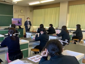 11月18日(金),草花専攻班3年生の「総合実習」の時間に,大崎市社会福祉協議会松山支部の方から「歳末たすけあい募金事業」について講話をいただきました。本校のシクラメンを地域見守りネットワーク事業に利用して,一人暮らしの高齢者の方々が毎年本校のシクラメンを待っていてくださることを伺い,とてもうれしく思いました。