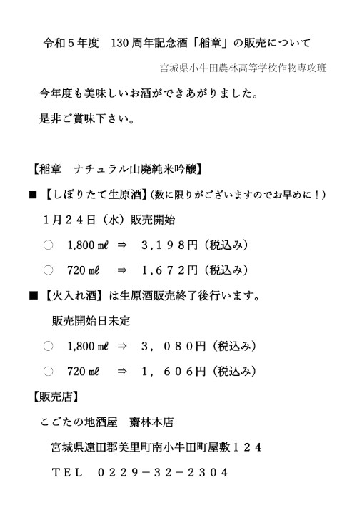 今年度も,宮城県小牛田農林高等学校130周年記念酒「生徒が育てたお米で、生徒が酒造り」4年目のチャレンジ酒が出来上がりました。販売開始は2月4日(土)です。ご注文やお問い合わせは、「有限会社齋林本店」様にお願いいたします。