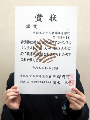 農林吹奏楽部として、初めてアンサンブルコンテストにて地区代表となり、県大会出場を決めることができました。今後とも応援をよろしくお願いいたします。