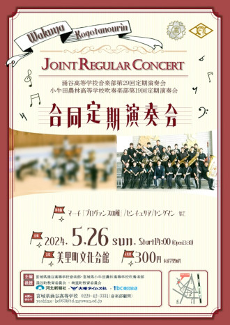 5月25日(日)に美里町文化会館にて、今年で3年目となる、涌谷高校音楽部さんとの合同定期演奏会を開催します。涌谷高校さんは第30回、小牛田農林は第20回目の節目となる定期演奏会となります。