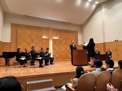 当日は,小学生から高校生までの受賞者一人ひとりが表彰を受けた後,作品発表・演奏会が行われました。児童・生徒が机上にて書き上げた作品を,音楽科教員と弦楽四重奏団がステージ上で音にして,皆で作品を共有し讃え合う心豊かな時間を過ごすことができました。