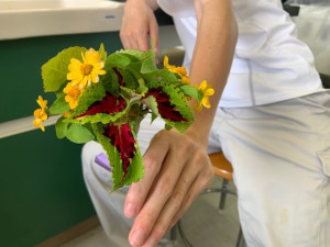 6月27日(月)に草花専攻班3年生9名が美里町にある花屋さんからコサージュ作りを学びました。材料に使用したのは,自分たちが種から栽培したマリーゴールドやペチュニアなどの春花壇苗です。たくさんある苗から自分の好きな花を選んで,ワイヤリングからピン止めまで一連の流れを学びました。初めて体験する作業に若干手こずりながらも人それぞれのコサージュを作ることができました。