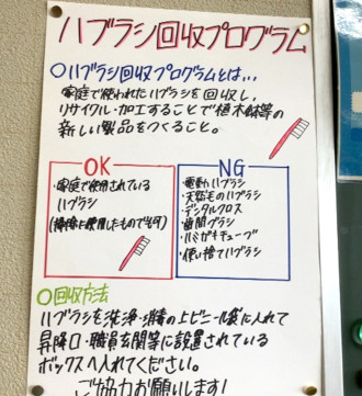 さらに,校内放送にて,全校生徒にハブラシ回収の呼びかけを行っています。回収締め切りを夏休み前に設定しており,できるだけ多くのハブラシが集まることを期待しています。