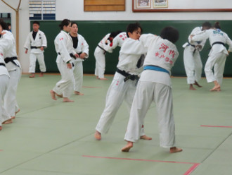 今年の東海大学は,全日本学生優勝大会において15年ぶりの男女アベック優勝を成し遂げたチームです。その優勝チームの女子柔道部の皆さんとエアコンの効いた柔道場で,充実した稽古をさせて頂きました。また,ユニバーシアード大会(イタリア・ナポリ)の女子57gkで優勝した部員もおり,生徒達と稽古をしてくれました。