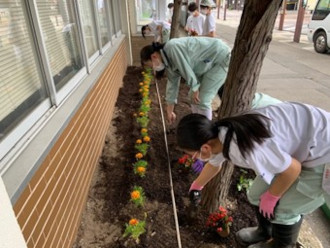 7月7日(木)総合実習の時間に草花専攻班2年生で小牛田駅の花壇に,メランポデュウムやベコニアなどを植えました。毎日たくさんの人が利用する小牛田駅なので,花壇を見ていただき,美里に来た人たちの心を癒やしていただければと思います。