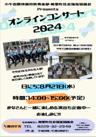 8月21日(水)に美里町駅東地域交流センター多目的ホールにて、町内の福祉施設を対象としたオンラインコンサートを開催します。美里町社会福祉協議会さんの協力のもと、今年で3回目の開催となります。