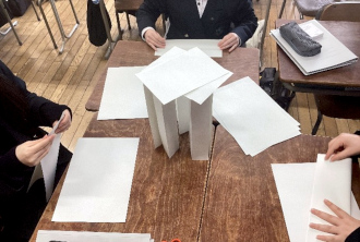 21日(火)の授業では、チームビルディングのための活動として、「ペーパータワーゲーム」を行いました。A4用紙のみを材料に、より高いタワーの完成をめざして、メンバーで試行錯誤し、絆を深めることができました。今後は、グループごとに課題を設定し、探究活動を進めていく予定です。