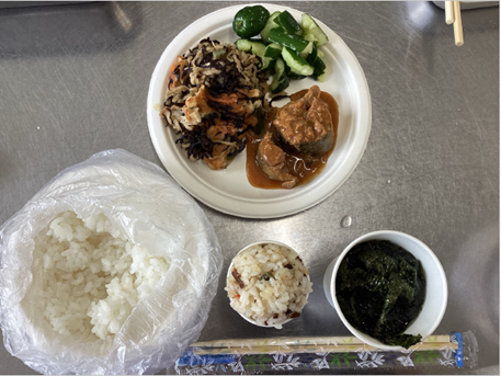 停電時や震災時の食事作りについて知り、常時買い置きしておくとよい食材について考え、実際に調理を行いました。ポリ袋で炊くご飯、包丁を使わないたたききゅうりの浅漬け、切り干し大根とひじきの乾物を使った煮物、乾燥具材を入れた簡易汁物、缶詰のサバの味噌煮の5品が献立として並びました。さらに、炊いたお米を乾燥させて作られた加工食品のアルファ米の試食も行いました。