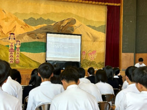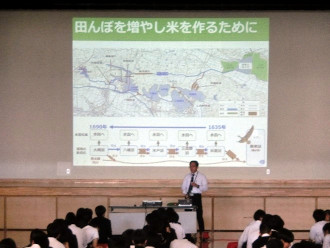 大崎市が誇る世界農業遺産である「大崎耕土」が、先人の苦労や工夫によってもたらされたものであるという話に、生徒たちは真剣な表情でメモをとりながら聴き入っていました。