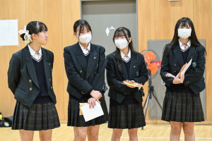 農業技術科農業科学コース畜産専攻のグループは「腸活豚」、総合学科自然科学系列のグループCは「どうしたら汚い水を利用することができるのか」、健康福祉系列のグループEは「子どもの体力低下に歯止めをかけるための学校での有効的な手立て」、人文社会系列のグループBは「男性がスカートを履けるようにするにはどうしたらよいか」、人文社会系列のグループDは「梨のワケあり商品をどう活かすか」というテーマで発表を行いました。