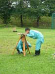 3人1組で平板という測量器械を使って時間内に正確に多角形の面積を割り出す競技です。作業がいくつかに分かれており、測定や計算を行います。チームワークや器械の扱い、計算の正確さが問われる競技です。