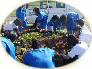 本校では東北自動車道長者原サービスエリアの花壇に植栽を行っています。本校では季節に応じた草花を植え、多くのドライバーに似喜ばれています。その活動が評価され、平成12年に日本道路公団東北支社より感謝状、13年には日本道路協会より表彰状をいただいています。このほかに、松島野外活動センターで花植えや、緑の羽根の募金稼動など、数々のボランティア活動を行っています。
